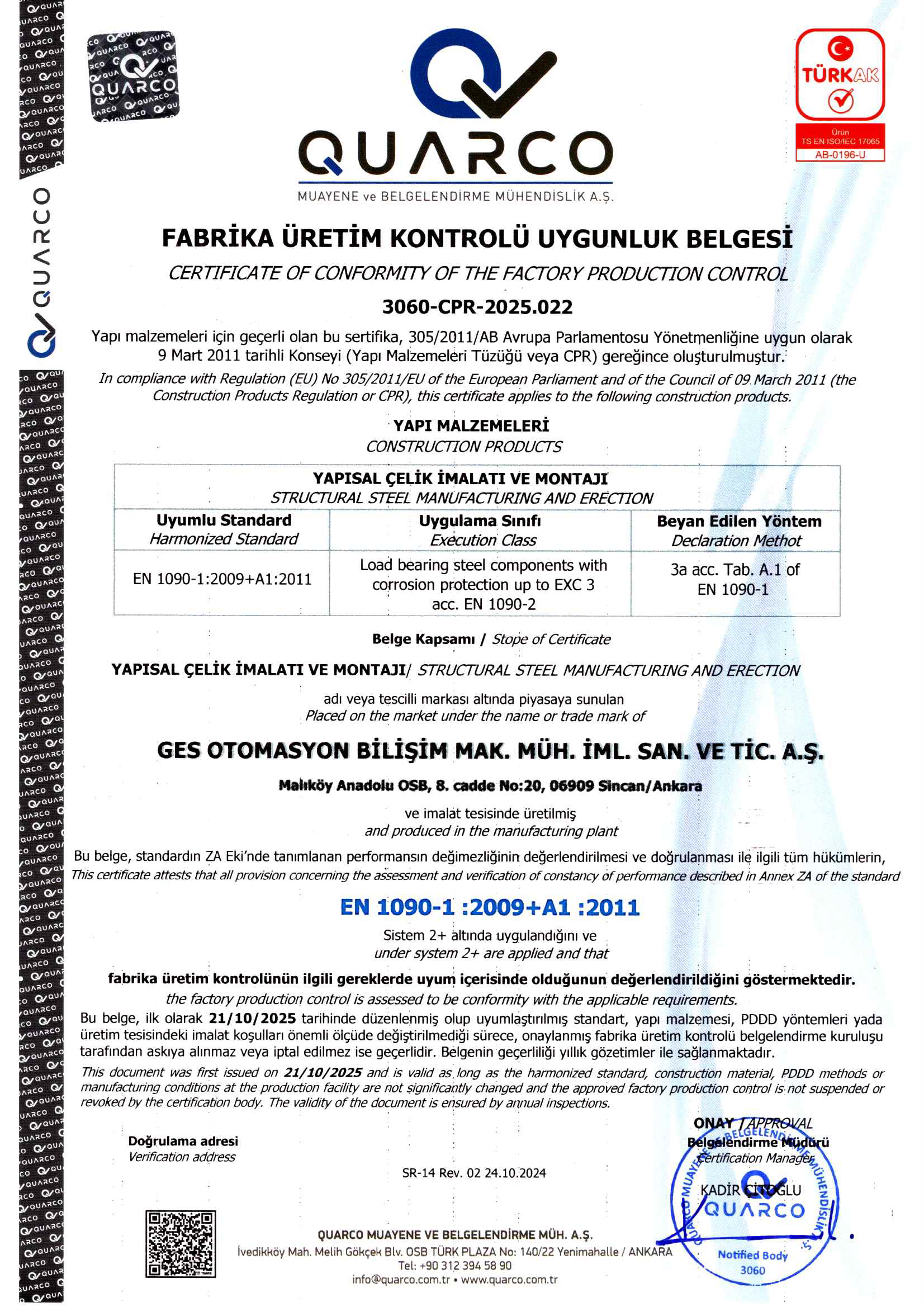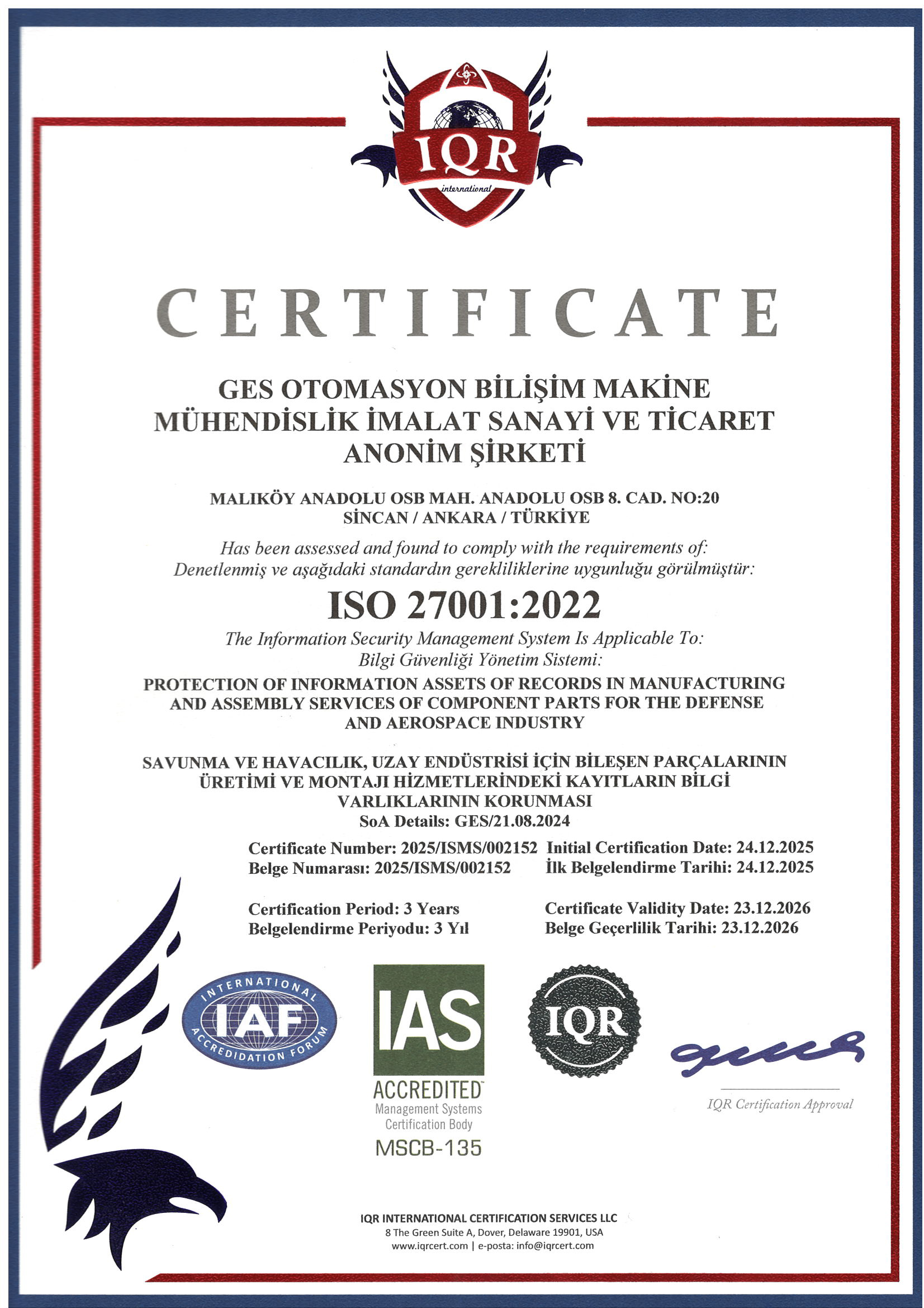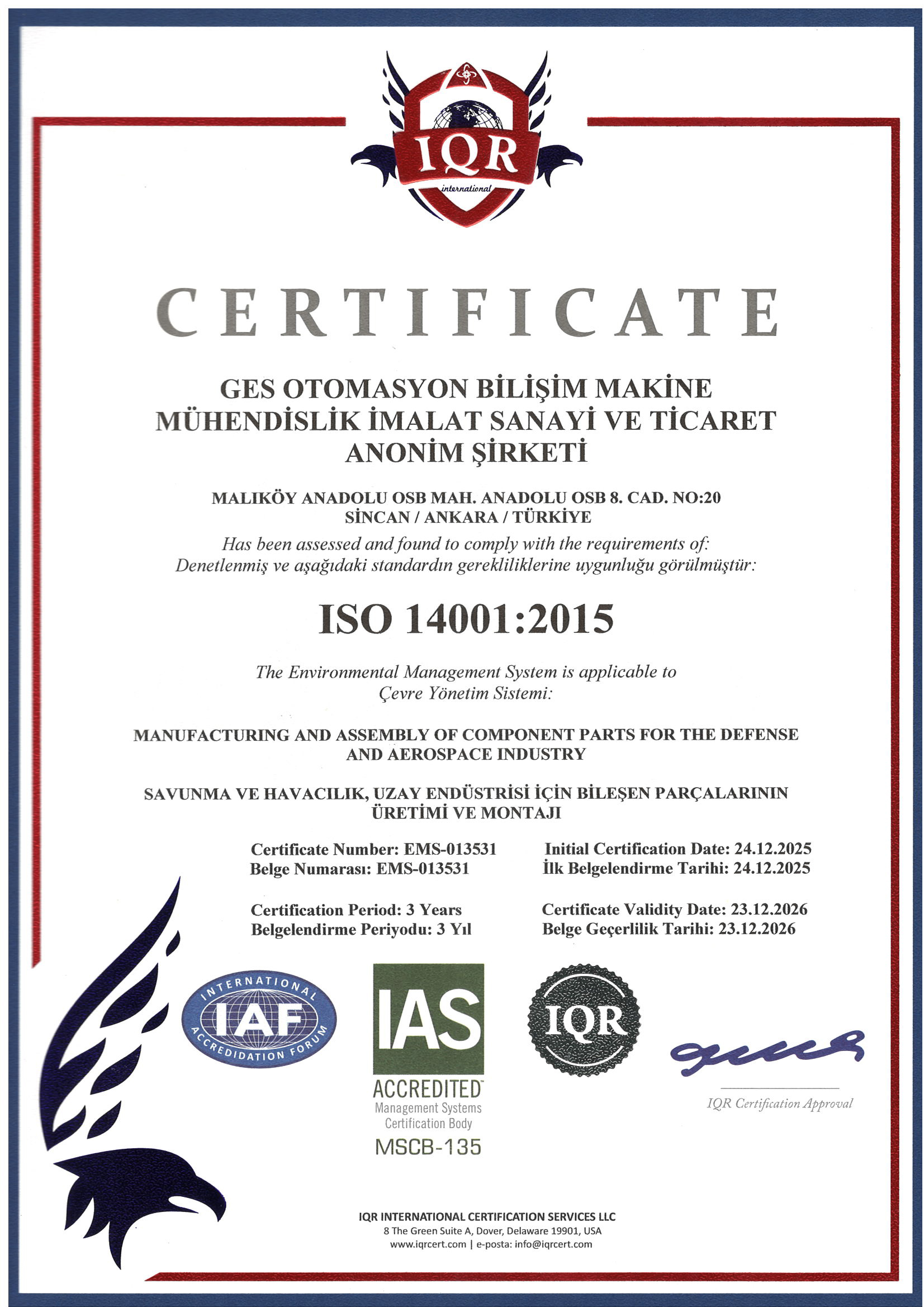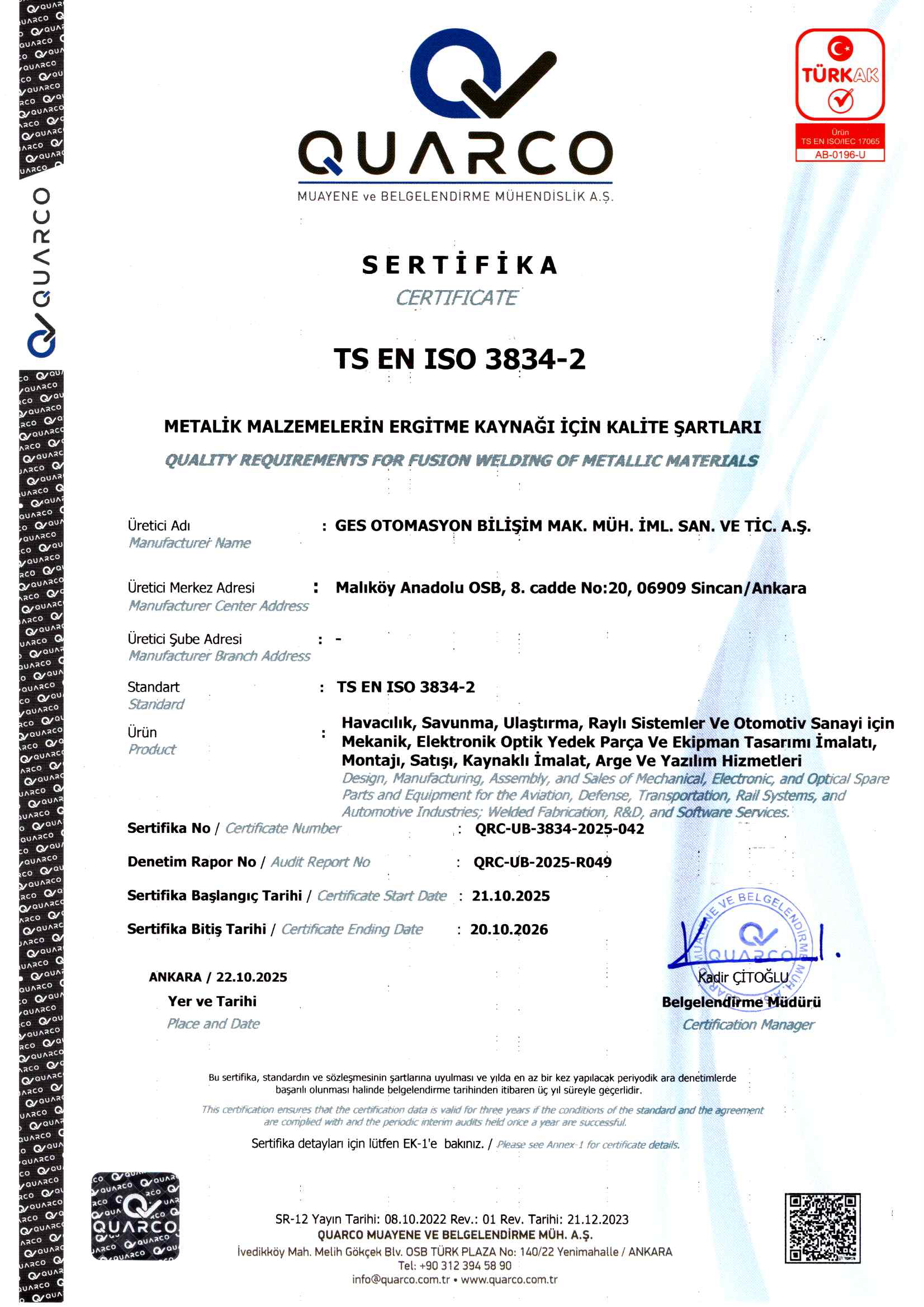 Havacılık ve Savunma Sanayi sektörlerinde faaliyet gösteren firmamızda iç ve dış paydaş memnuniyetini en üst düzeyde tutan, müşteri isterlerini zamanında ve eksiksiz karşılayan, tüm süreçlerinde sürekli iyileşmeyi ve gelişmeyi amaçlayan kalite yönetim sisteminin devamlılığını sağlayıp geliştirmektir.